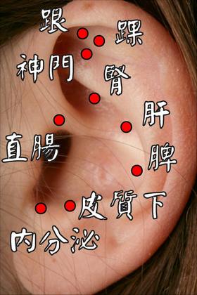 ◎ 再 在 耳 廓 : 肝 、 腎 、 內 分 泌 、 神 門 、 皮 質 下 、 踝 、 跟 等 穴 位 貼 上 壓 丸 , 並 噣 咐 患 者 時 加 揉 按 。