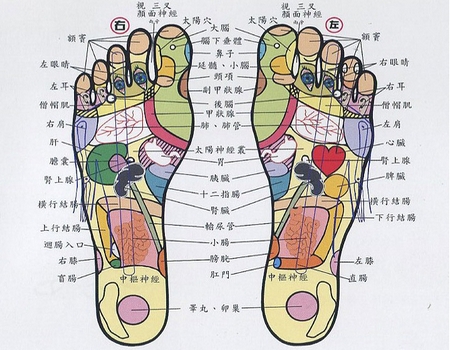 根 據 「 足 底 全 息 」 圖 譜 顯 示 , 足 跟 底 部 是 肛 門 、 乙 狀 結 腸 及 生 殖 器 的 反 應 區 。 當 腸 胃 或 生 殖 器 罹 患 疾 病 時